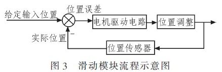 如圖3滑動模塊流程示意圖所示,本系統(tǒng)方案設(shè)計(jì)在傳輸系統(tǒng)和SMT生產(chǎn)設(shè)備的連接處,增設(shè)一個滑動裝置,主要由滑動板、滾珠和位置傳感器組成,形成了一個閉環(huán)控制,起到平衡作用。在生產(chǎn)過程中,由模塊裝置上的位置傳感器實(shí)時將實(shí)際位置信號反饋給系統(tǒng),與給定輸入位置信號相比較產(chǎn)生一個位置誤差信號,然后由這個誤差信號驅(qū)動電機(jī)運(yùn)轉(zhuǎn)進(jìn)行位置調(diào)整。當(dāng)設(shè)備平衡時,位置誤差為零,不進(jìn)行位置調(diào)整;當(dāng)傳輸機(jī)有偏斜時,位置誤差不為零,由它驅(qū)動電機(jī)運(yùn)轉(zhuǎn),使設(shè)備進(jìn)行一定的位置調(diào)整。通過這套裝置,消除由振動產(chǎn)生位置偏移、利于整個生產(chǎn)線的生產(chǎn)、增強(qiáng)各設(shè)備之間銜接。