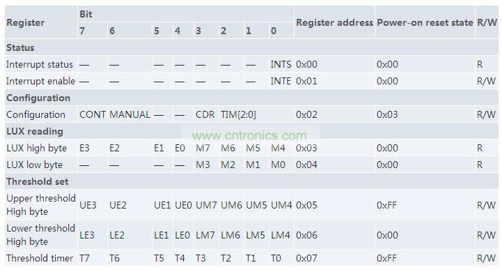 當(dāng)光積分時(shí)間為100ms的倍數(shù)(如:100/200/400/800ms)時(shí),這些環(huán)境光傳感器能夠很好地抑制50Hz/60Hz噪聲干擾。然而,多數(shù)情況下,很多應(yīng)用需要一個(gè)轉(zhuǎn)換完成信號(hào),在可靠讀取環(huán)境光傳感器信息時(shí)避免不必要的延遲。本應(yīng)用筆記主要介紹如何使用器件的中斷引腳提供轉(zhuǎn)換完成指示,詳細(xì)說明I²C寄存器的設(shè)置方法。