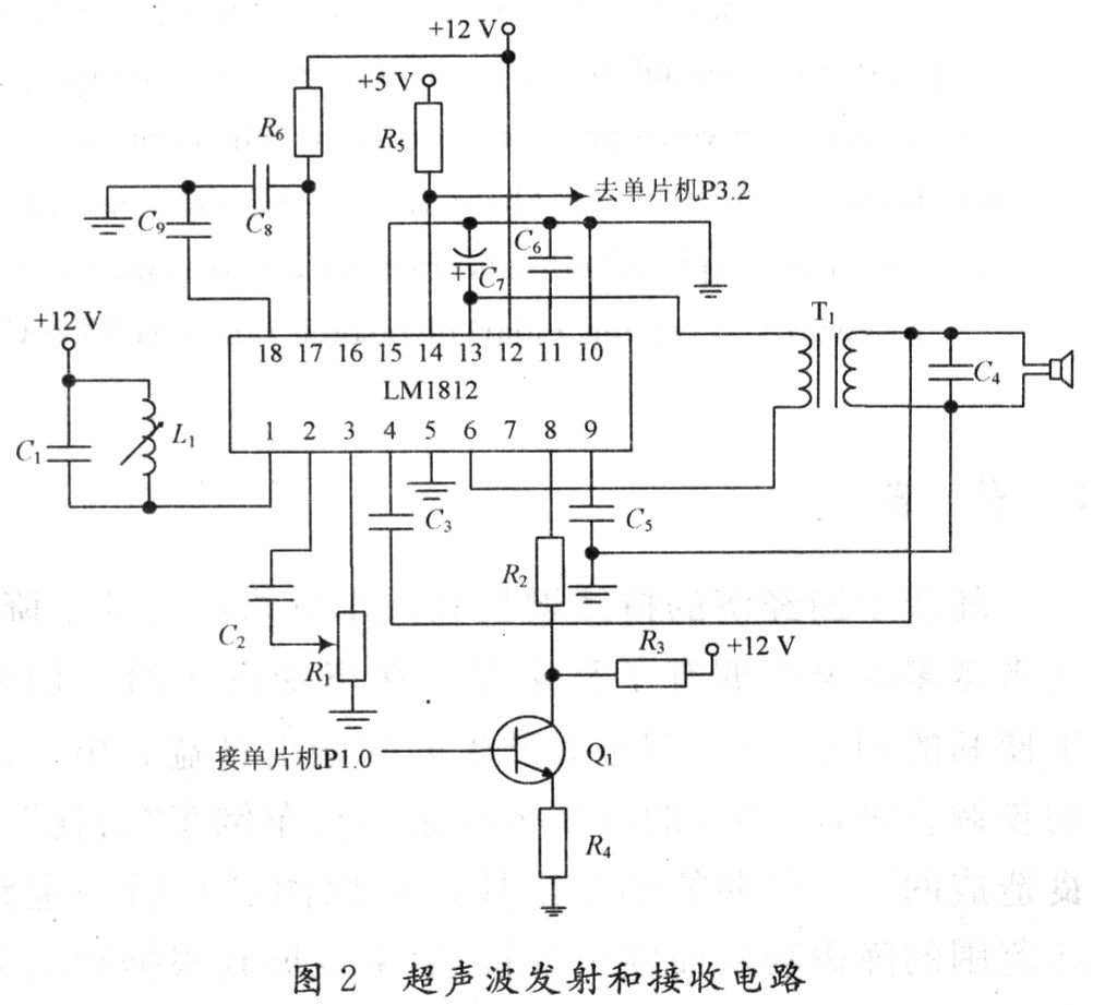 超聲波發(fā)射和接收電路如圖2所示。當(dāng)LM1812的8腳為高電平時(shí),LM1812處于發(fā)射模式;當(dāng)8腳為低電平時(shí),LM1812處于接收模式。值得注意的是,單片機(jī)到LM1812的連接要進(jìn)行5~12 V的電平轉(zhuǎn)換。當(dāng)LM1812處于發(fā)射模式時(shí),L1,C1振蕩槽路被切換為振蕩模式,振蕩信號經(jīng)驅(qū)動放大后,由13腳及6腳輸出。6,13腳之間所接變壓器線圈的匝數(shù)比是根據(jù)TCF40-25TR1型收發(fā)一體式超聲波傳感器的阻抗來確定的。實(shí)驗(yàn)證明,變壓器線圈的匝數(shù)比大約為4:1時(shí)可實(shí)現(xiàn)與超聲波發(fā)送器阻抗相匹配。超聲波接收器接收到的超聲波信號經(jīng)電容耦合由4腳輸入,再經(jīng)內(nèi)部兩級放大后同由1腳的諧振回路取出的信號一起送到檢測器。當(dāng)檢測到超聲波回波信號時(shí),LM1812的14腳(與單片機(jī)的INT0端相連)變?yōu)榈碗娖?,使單片機(jī)的T0計(jì)數(shù)器停止計(jì)數(shù)。