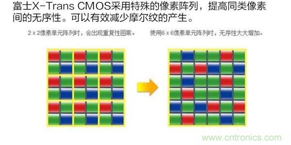 傳統(tǒng)的拜耳陣列傳感器,R/G/B三色的點陣距離相同,因此在拍攝特定密度的規(guī)律物體時,就容易產(chǎn)生摩爾紋。富士的X-Trans CMOS采用了全新色彩濾鏡陣列,降低了傳感器像素間的規(guī)律性,使得像素點本身有類似膠片銀鹽顆粒的不規(guī)則排列效果,從而降低摩爾紋的產(chǎn)生。