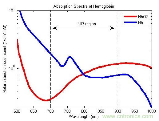 一般來講,完整的血氧飽和度儀往往有2種發光二極管,一種波長660nm,是可見光的紅光,一種波長900多nm,是紅外線。血管中攜氧的血紅蛋白和不攜帶氧的血紅蛋白,對兩種光的吸收率是不同的。如下圖。