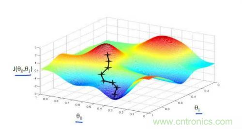 以上我們是以一維數據來看梯度下降,但我們的照片是多維數據,此時如何求導數?又如何梯度下降呢?此時我們需要用到偏導數的概念。其實它與導數很相似,因為x是多維向量,那么我們假定計算Xi的導數時,x上的其他數值不變,這就是Xi的偏導數。此時應用梯度下降法就如下圖所示,θ是二維的,我們分別求θ0和θ1的導數,就可以同時從θ0和θ1兩個方向移動相應的步長,尋找最低點,如下圖所示: