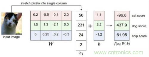 比如我們有訓練數據集照片對應著cat、dog、ship三個類別,某個輸入照片經過函數f(x)=x*W+b,前向運算得到該照片屬于這3個分類的得分值。此時,這個函數被稱為得分函數,如下圖所示,假設左邊關于貓的input image是一個4維向量[56,231,24,2],而W權重是一個4*3的矩陣,那么相乘后再加上向量[1.1,3.2,-1.2]可得到在cat、 dog、ship三個類別上的得分:
