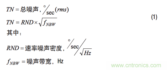 傳感器固有噪聲代表的是陀螺儀在靜態(tài)慣性和環(huán)境條件下運行時其輸出中的隨機振動。MEMS IMU數(shù)據(jù)手冊通常會提供速率噪聲密度(RND)參數(shù)來描述陀螺儀相對于頻率的固有噪聲。此參數(shù)通常使用單位°/s/√Hz,是預測特定濾波器配置固有噪聲的關鍵。公式1給出了一種簡單方法來估算與特定頻率響應(噪聲帶寬)和RND相關的噪聲。