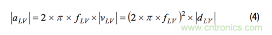 由于陀螺儀用于測量旋轉角速率,因此其對線性運動的響應會引入測量誤差。MEMS IMU數(shù)據(jù)手冊通常通過“線性加速度對偏置的影響”或“線性加速度”等參數(shù)來描述對線性運動的這一響應,這些參數(shù)通常使用單位°/s/g。線性振動是一種重復的慣性運動,其幅度大小可通過位移(m)、線性速度(m/s)或線性加速度(m/s2或g)表示。在特定的振動頻率(fLV)下,位移(|dLV|)、速度(|vLV|)和加速度(|aLV|)之間的幅度關系如公式4所示。