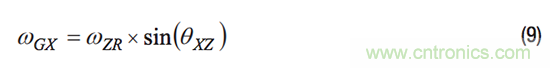 每個陀螺儀的對齊誤差均具有兩個分量,分別定義其相對于慣性參考系中另一個軸的對齊誤差。例如,對于圖2中的系統(tǒng),θXZ代表x軸陀螺儀相對于z軸的對齊誤差。此對齊誤差定義有助于建立公式以計算離軸陀螺儀對系統(tǒng)慣性參考系中圍繞另一個軸旋轉運動的響應。公式9中給出了一個示例,其量化了x軸陀螺儀相對于z軸的對齊誤差(θXZ)和圍繞z軸旋轉(ωZR)而產(chǎn)生的響應(ωGX)。