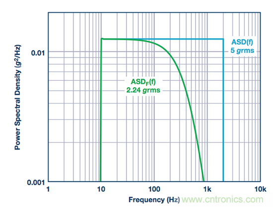 全帶寬配置匹配與ADIS16488A針對固有傳感器噪聲的0.135°/s(rms)的輸出噪聲規(guī)格相關的條件。對于振動貢獻,圖3給出了曲線說明ASD(f)以及濾波曲線ASDF (f)。ASDF (f)中的頻率響應反映了與此IMU陀螺儀信號路徑中雙極點(404 Hz,757 Hz)低通濾波器相關的衰減曲線。