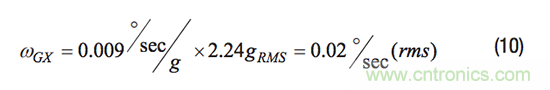 公式10通過線性加速度參數(shù)乘以ASDF (f)曲線幅值2.24 g rms,可估算產(chǎn)生的噪聲電平為0.02°/s (rms)。此噪聲電平比通過公式5得到的0.045°/s (rms)低55%,公式5的方法未采用頻譜項評估此噪聲源。這種改善是采用頻譜項定義振動曲線以獲取值的一個示例。