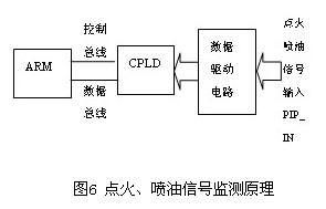 點火和噴油信號是汽車發(fā)動機中的關鍵信號,其周期和時序直接關系到汽車的運行狀態(tài),因此監(jiān)測它們的周期和時序尤為重要。本系統監(jiān)測原理圖如圖6 所示,對于點火信號的監(jiān)測,主要是監(jiān)測它與CPS信號的同步,以及兩個或四個點火信號之間的時序關系。當CPLD尋找到點火信號與CPS同步的起始點后,根據輸入的PIP_IN信號,對各點火信號進行計數。每當一個點火周期完成后,在下一個點火周期向ARM 單片機產生一個中斷信號。該中斷信號觸發(fā)ARM 單片機進入中斷處理程序,在該中斷程序中,ARM單片機讀入對各點火信號的計數值,判斷點火信號的時序和周期,并設置點火信號正常與否的標志。對于噴油信號的監(jiān)測,主要是監(jiān)測它與CPS信號的同步,以及它們之間的時序關系。當PIP_IN信號中四個噴油信號中任何一個信號的下降沿到來時,CPLD都會監(jiān)測其它三個噴油信號的狀態(tài),如果其它三個噴油信號的狀態(tài)正常,即給出噴油信號正常標志,反之給出噴油信號異常標志。